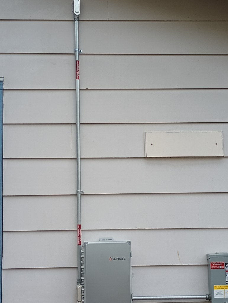 The panels are mounted on a frame, and the panels themselves actually sit an inch or two above the roof. The wiring goes through our attic and down some conduit on the outside to the micro-inverter panel and rapid shutdown switch mounted on our outside wall near the meter (and outside from our electrical panel).